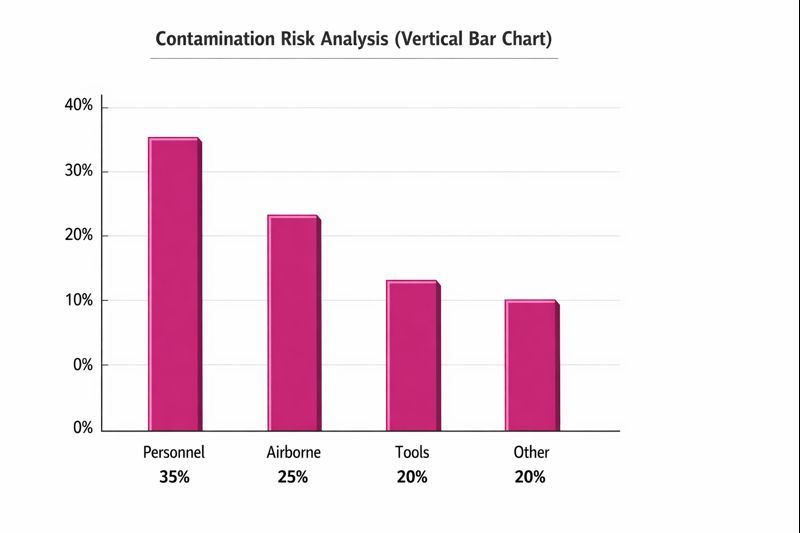 Diagrama cu bare verticale demonstrează că mișcarea personalului contribuie cel mai mult la contaminarea încrucișată în camerele curate, punând accent pe îmbrăcămintea adecvată și manipularea ștergerilor.