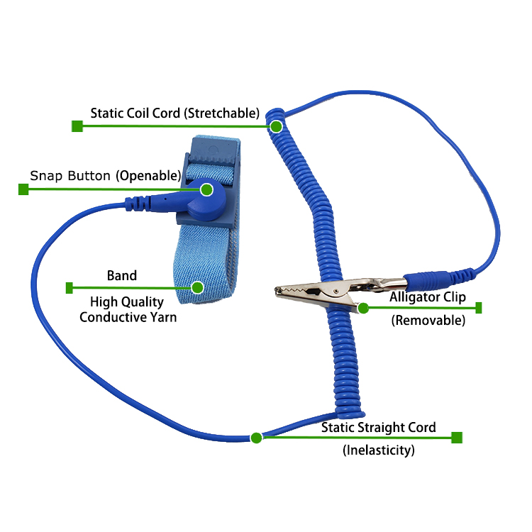 Firul curea anti-statică a încheieturii Exportă eficient electricitatea statică umană pe pământ prin cureaua încheieturii și sârmă de împământare pentru a împiedica electricitatea statică să deterioreze componentele electronice sensibile. Acest proces asigură siguranța și fiabilitatea prin rezistență stabilă.